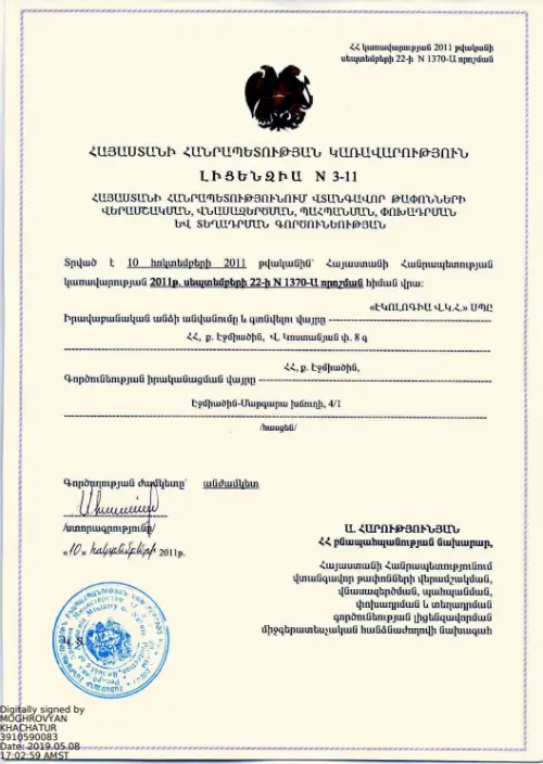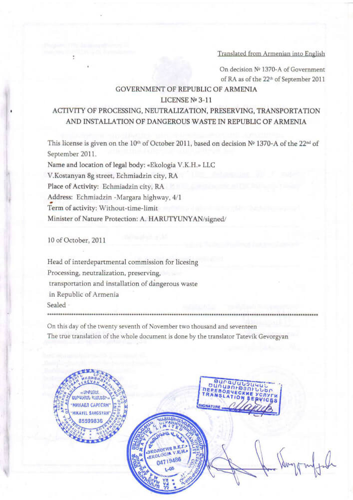 It is the unique company operating in Armenia that provides hazardous waste recycling, neutralization (treatment), storage, transportation and disposal services.